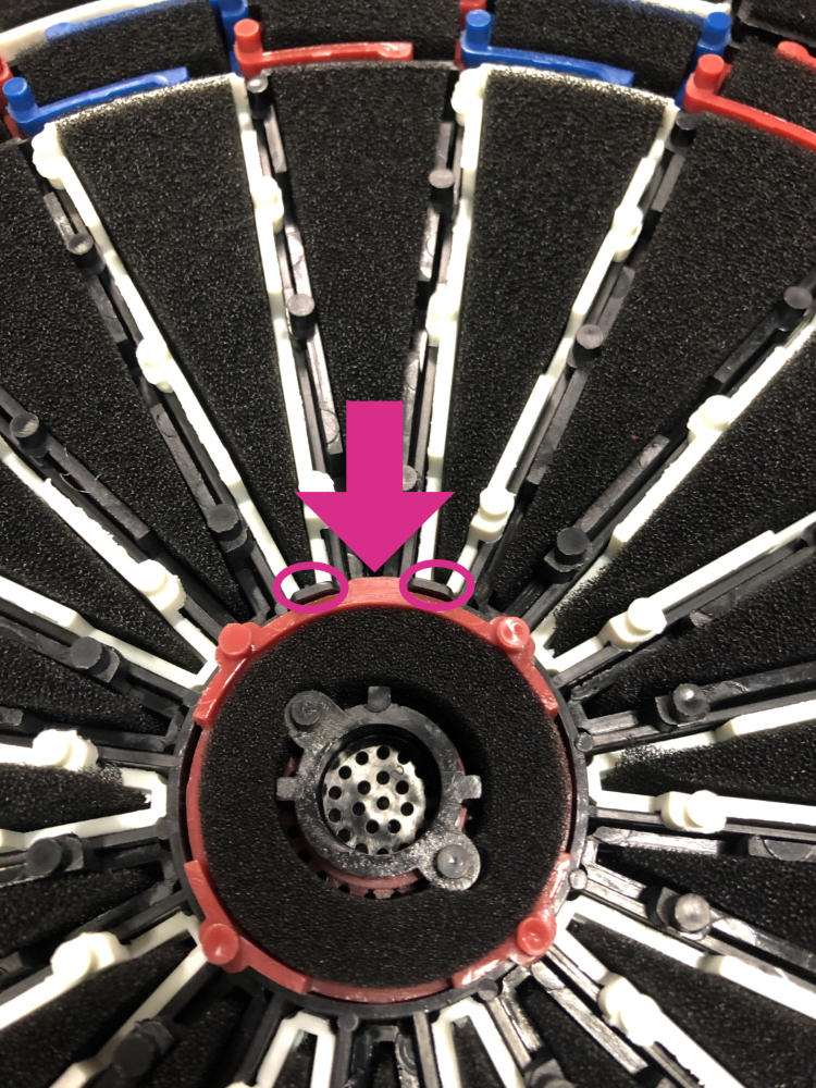 Because of its round shape, the bullseye has a small protrusion on it to prevent from rotating. If this protrusion is not installed properly (facing towards number 20 is correct position), the segment will continue to rotate, causing the GRANBOARD not to register the hit.