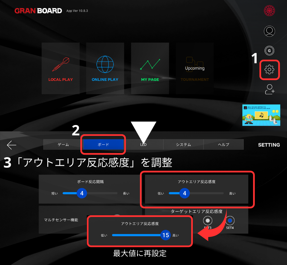 アウトが正しく登録されない場合は、まず「ボード/ゲーム設定」内にあるアウトエリア反応感度の再調整をお勧めします。